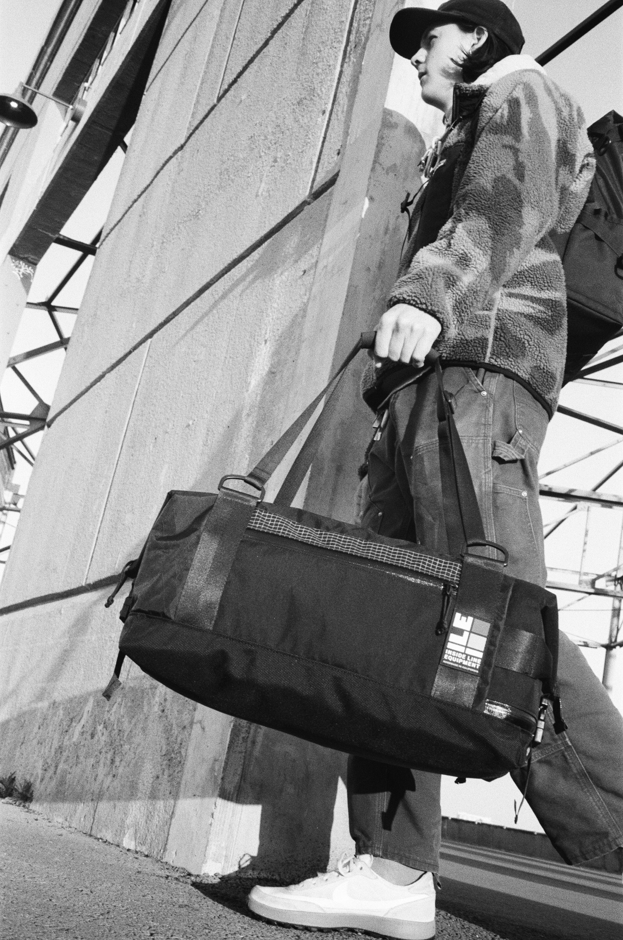 Blackout Patchwork pieces are made using panels of four hard-wearing, weatherproof fabrics: VX21 XPAC, X50 XPAC, 500D Cordura / 275 Dyneema Ripstop, and 1050D Ballistic Nylon. To maximize functionality the fabrics appear in a gradient from heaviest at the bottom to lightest up top.