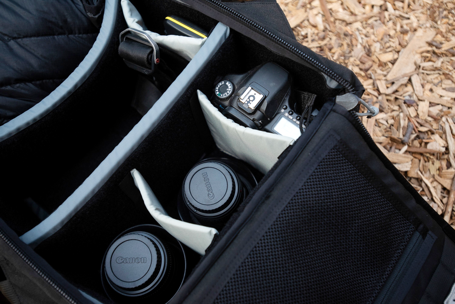 - Weatherproof, padded camera compartment, with two Velcro partitions and eight moveable Velcro dividers